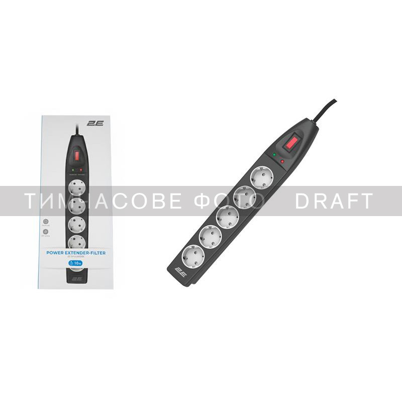 2E Подовжувач-фільтр мережевий 2E 5xТип F, 3x1.5мм кв, 16A, з захистом від перенапруги, 10м, чорний (2E-SP515M10BK)