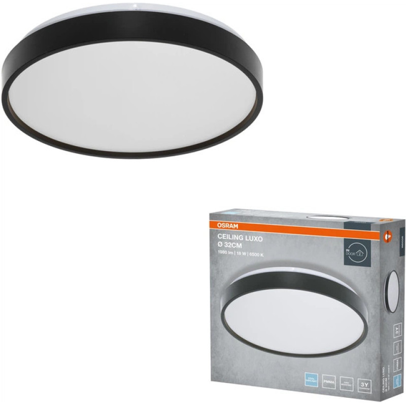 Світильник накладний OSRAM CEILING LUXO має круглу форму діаметром 32 см. Потужність становить 18 Вт, колір світіння — холодний 6500 K. Світловий потік досягає 1980 лм при куті розсіювання 120°. Основу виконано з металу чорного кольору, а плафон — з білого полімеру. Висота виробу 70 мм, вага 0,532 кг, термін служби 30 000 годин.
