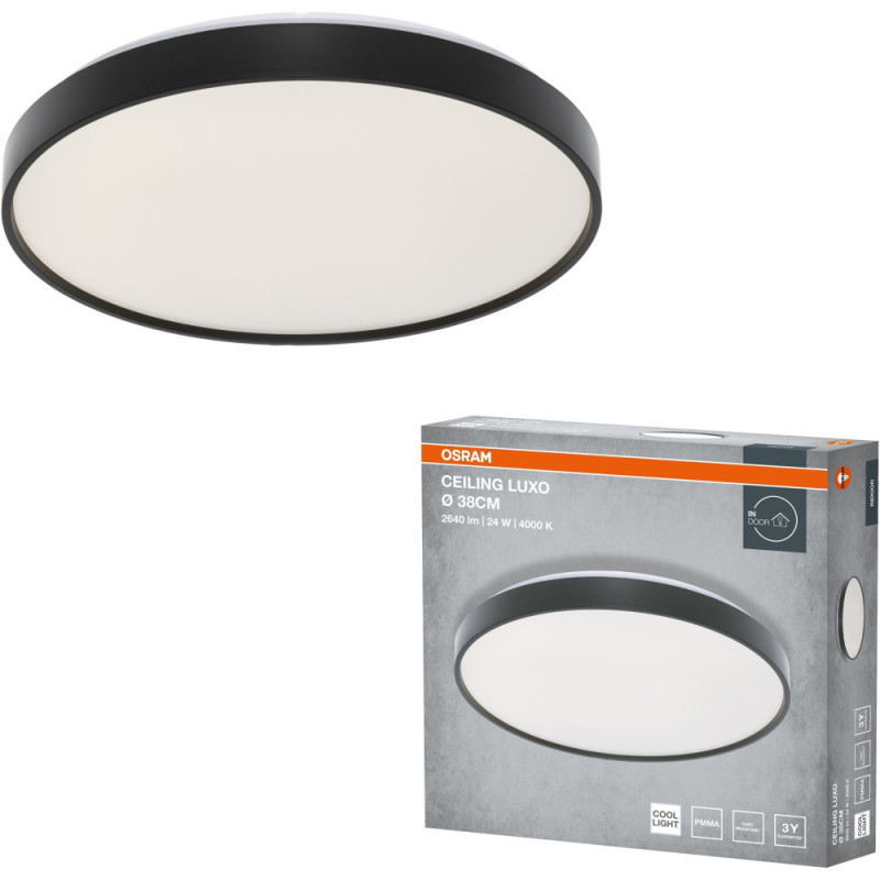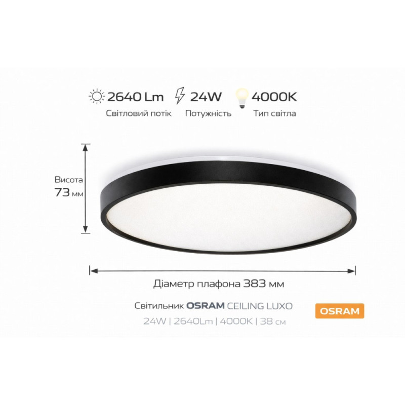 Світильник накладний OSRAM CEILING LUXO має круглу форму діаметром 38,3 см. Потужність становить 24 Вт, колір світіння — нейтральний 4000 K. Світловий потік досягає 2640 лм при куті розсіювання 120°. Основу виконано з металу чорного кольору, а плафон — з білого полімеру. Висота виробу 73 мм, вага 0,72 кг, термін служби 30 000 годин.