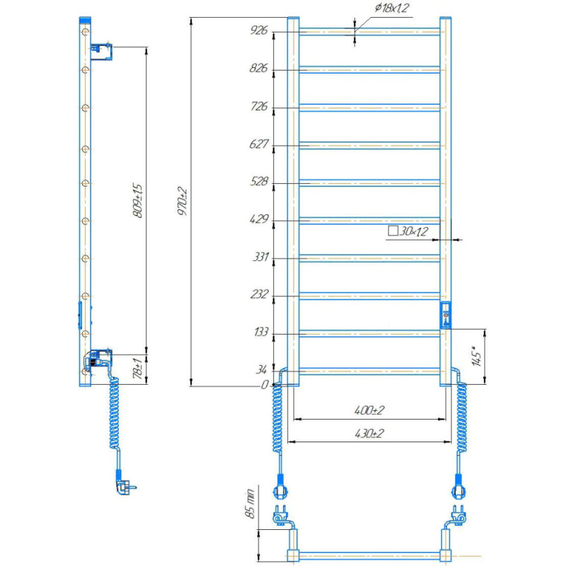 Електрична рушникосушарка HF Leeds 970×430. Працює за технологією сухого ТЕНу. Обладнана вбудованим таймер-регулятором і конектором для підключення до живлення з будь-якого боку. Оснащена комплектом для прихованого підключення.