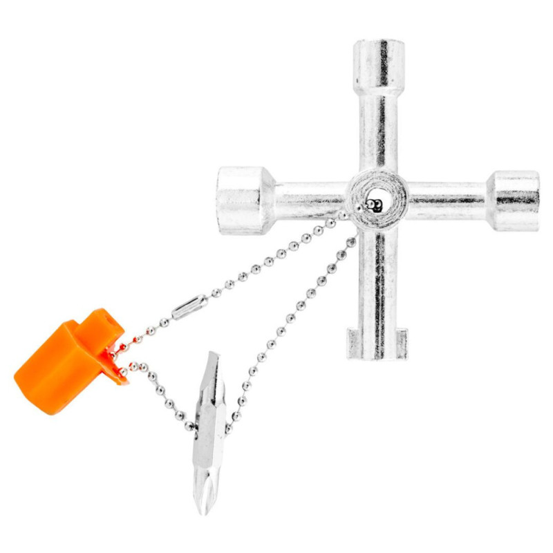 Ключ для шкафа Neo Tools 02-001 предназначен для открытия инструментальных тележек и шкафов с различными типами замков. Компактная конструкция с набором наконечников обеспечивает универсальность применения. Изделие изготовлено из сплава ZnAl с хромированным покрытием. Цепочка удерживает все элементы вместе. Подходит для профессионального и бытового использования.