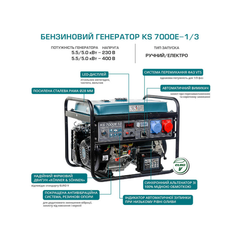 Könner & Söhnen Бензиновый генератор KS 7000E 1/3, 230/400В, 5.5/5.0кВт, 25л, LED-дисплей, АВР(ATS), 81кг (KS7000E-1/3)