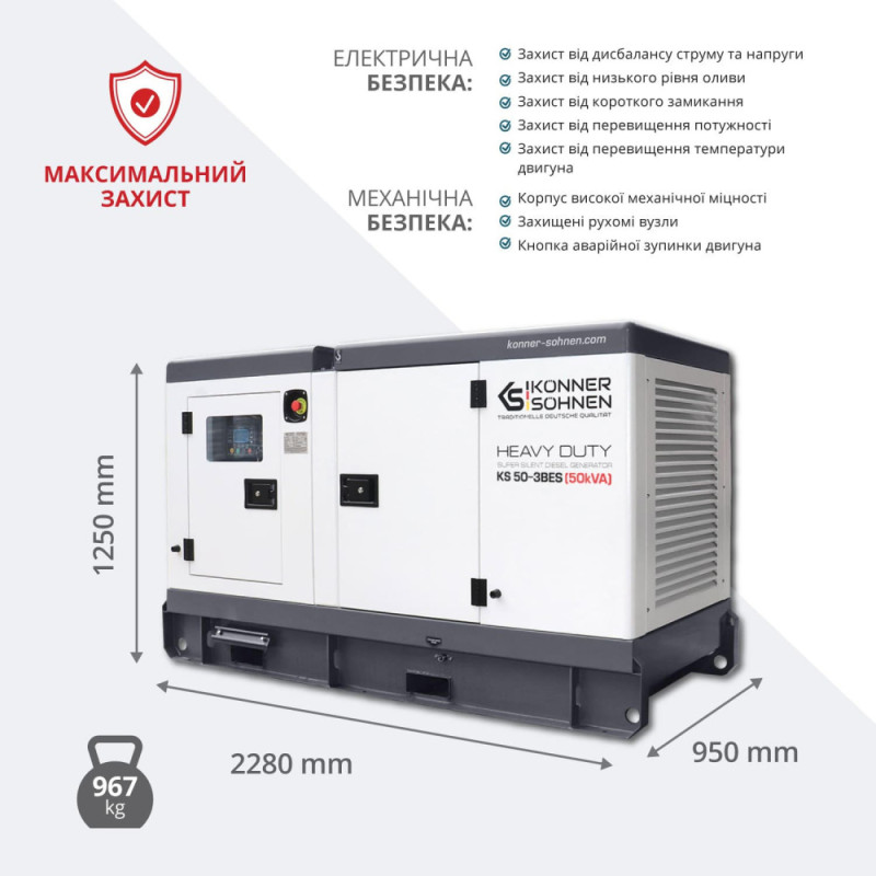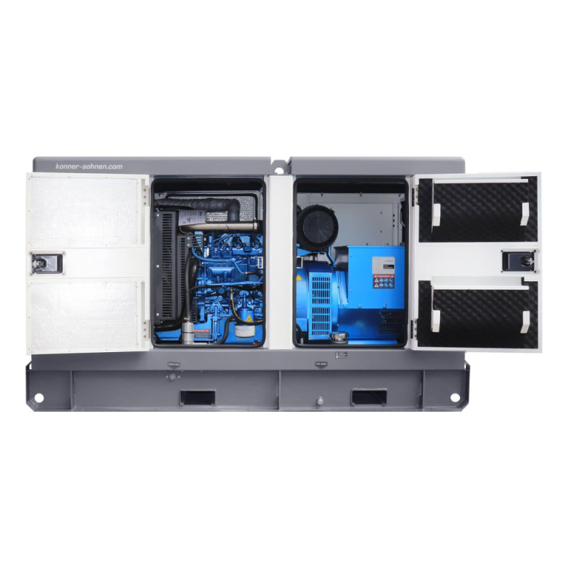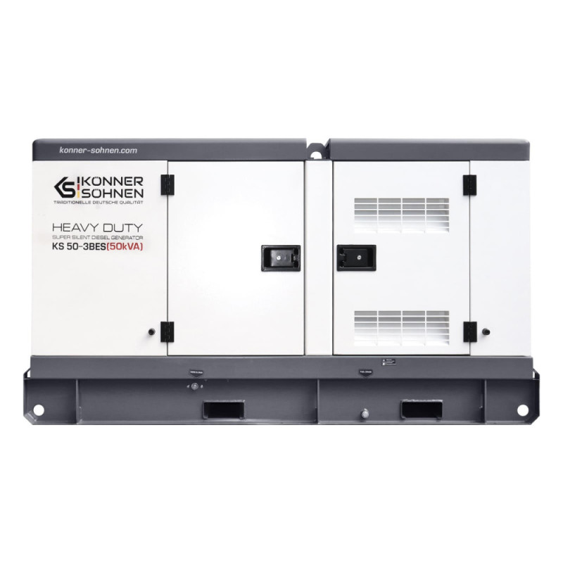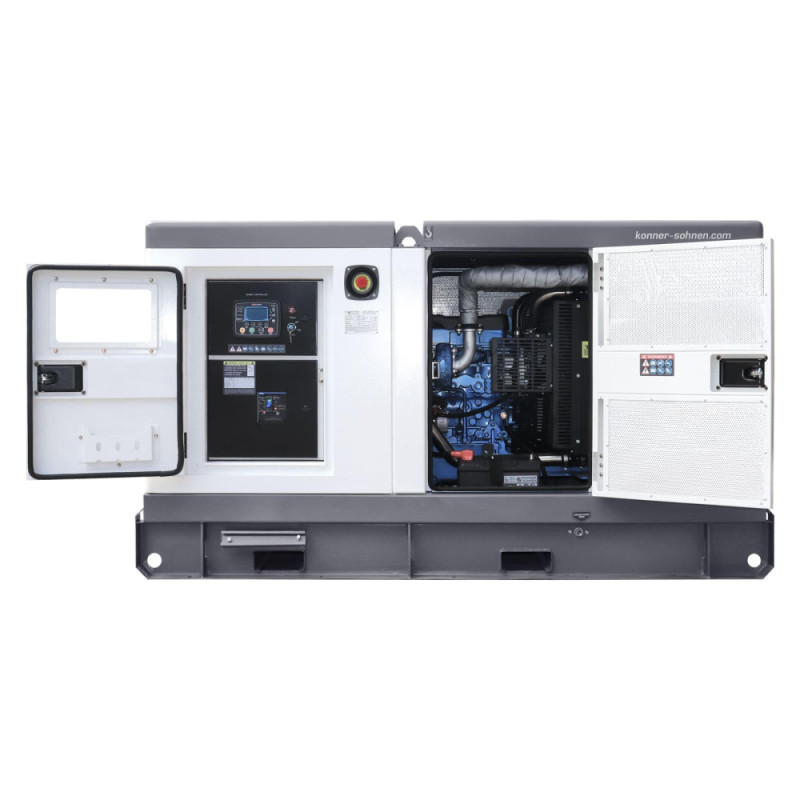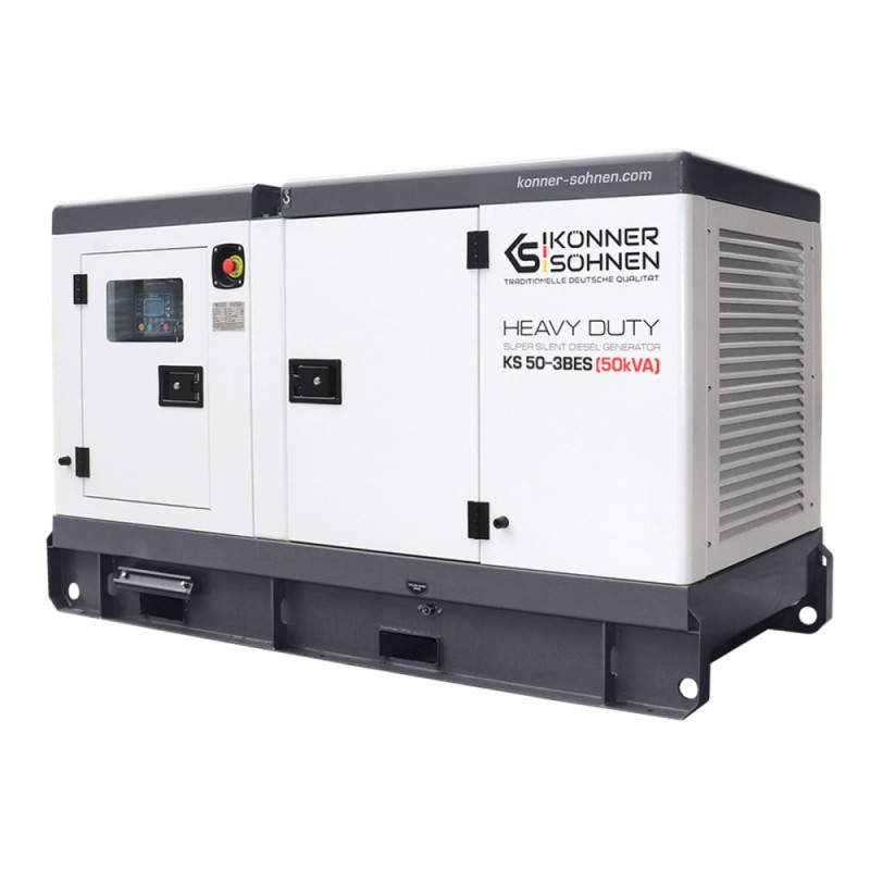 Дизельный генератор Konner&Sohnen KS 50-3BES выдаёт номинальную мощность 45 кВА и максимальную 50 кВА при 230/400 В в трёхфазном режиме. Жидкостное охлаждение двигателя Baudouin обеспечивает стабильную работу в жарких условиях, а шумозащитный корпус держит уровень шума на 68 дБ. Предстартовый подогрев облегчает запуск при низких температурах, а контроллер Datakom D300 контролирует параметры и сигнализирует о неисправностях. Поддержка ATS позволяет автоматический переход на резервное питание.