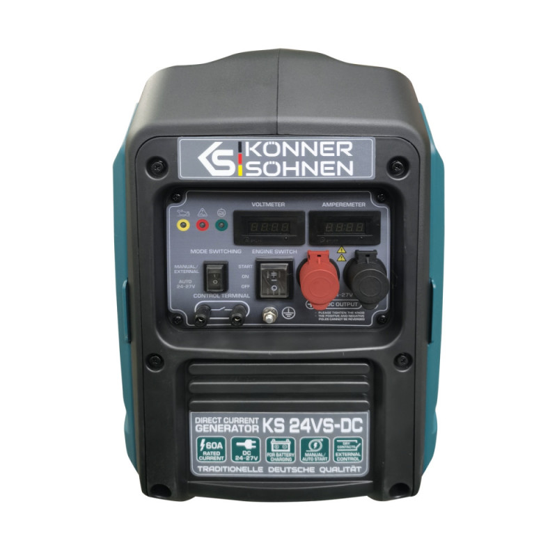 Генератор постоянного тока Konner&Sohnen KS 24VS-DC выдаёт напряжение 24-27 В с максимальным током 60 А, работая на бензине с 4-тактным двигателем. Автоматический режим запускает устройство для зарядки аккумуляторов при падении заряда, а ручной режим позволяет управлять вручную или через внешние контакты. Шумозащитный корпус держит уровень шума на 62 дБ на расстоянии 7 м, что подходит для использования возле жилья или рабочих зон.