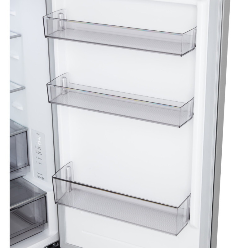Холодильник LG GC-B459EMYM с нижней морозильной камерой распределяет 333 литра объема между 220 литрами для свежих продуктов и 113 литрами для замороженных. Total No Frost в сочетании с Multi Air Flow поддерживает равномерную температуру без инея на стенках. Инверторный компрессор ограничивает шум до 35 дБ, а класс E держит годовой показатель на уровне 253 кВт·ч. DoorCooling+ оперативно охлаждает полки дверей, ThinQ с Wi-Fi упрощает отслеживание через приложение. Внутренний дисплей и Fresh Zone добавляют удобства для ежедневного хранения.