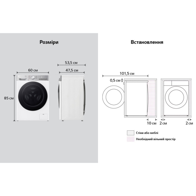 Особенности:Smart Diagnosis, Технология определения свойств ткани AI DD™, Функция сушки EcoHybrid, Функция стирки паром Steam™, Автоматический перезапуск с сохранением предыдущих настроек, Технология ''6 движений заботы'' 6 Motion, Оставшиеся остаточные индикации времени, Система уменьшения уровня вибрации, Система контроля пенообразования, Технология контроля напряжения (174-400 В), Блокировка панели управления от детей, индикатор этапа цикла стирки, индикация режима "Блокировка от детей", индикация незакрытой дверцы, индикация ошибок в работе, задержка завершения цикла стирки (3-19 часов), Функция обработки паром Steam, открытие дверей: справа, Увеличенный размер переключателя программ, индикация режима "Отложить завершение", индикация режима "Удаленный старт", Загрузка дополнительных приложений через приложение LG ThinQ™ по Wi-Fi, TurboWash 360˚, индикация выбранных параметров программы, Возможность загрузить дополнительные программы стирки, загружаемые через приложение LG ThinQ, Возможность загрузить дополнительные программы сушки, загружаемые через приложение LG ThinQ, Удаленное управление через приложение LG ThinQ по Wi-Fi