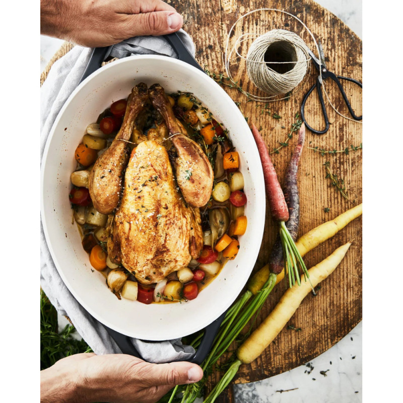 Кастрюля Tefal Air объемом 5,7 л изготовлена из литого алюминия и имеет керамическое внутреннее покрытие для удобного ежедневного приготовления блюд. Конструкция значительно легче классических чугунных моделей, а крышка с конденсационным эффектом помогает сохранять сочность ингредиентов. Модель совместима со всеми типами плит, выдерживает запекание в духовке до 250 °C и поддерживает мытье в посудомоечной машине.