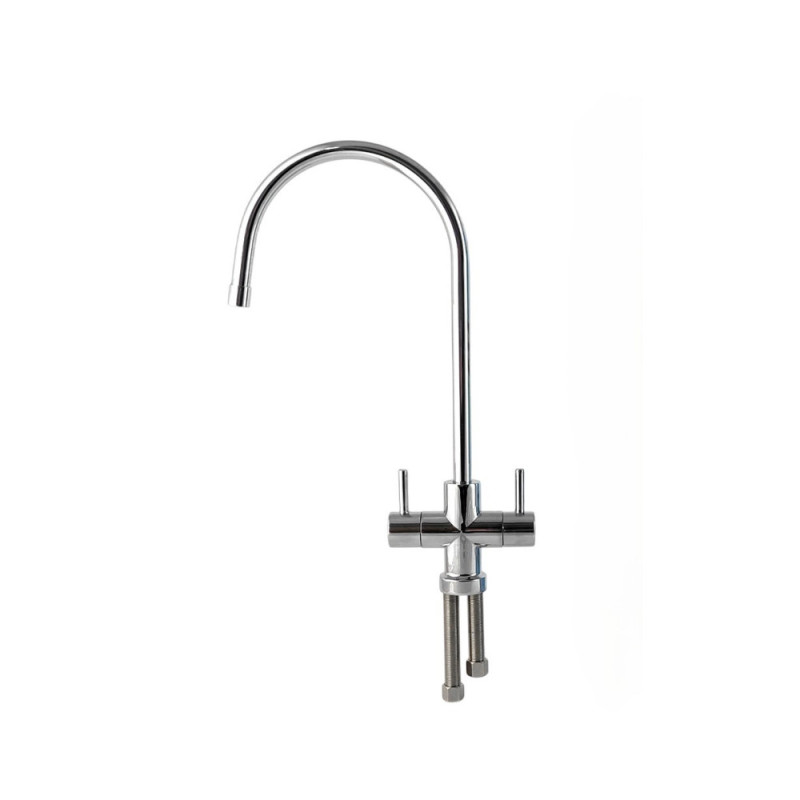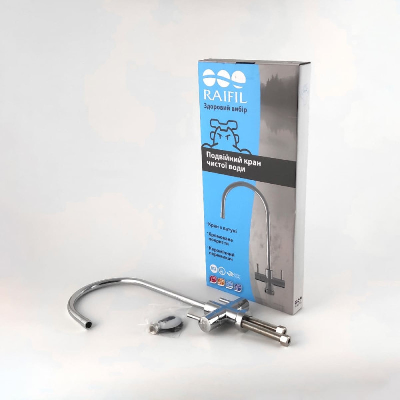 Кран чистой воды F-09 Raifil Duo предназначен для подачи очищенной и дополнительно минерализованной воды после систем обратного осмоса. Изготовлен из латуни с хромированным покрытием и оснащен двумя вентилями для раздельной подачи воды. Монтируется на кухонную мойку или столешницу. Подключается к бытовым системам фильтрации через резьбовое соединение 1/4".