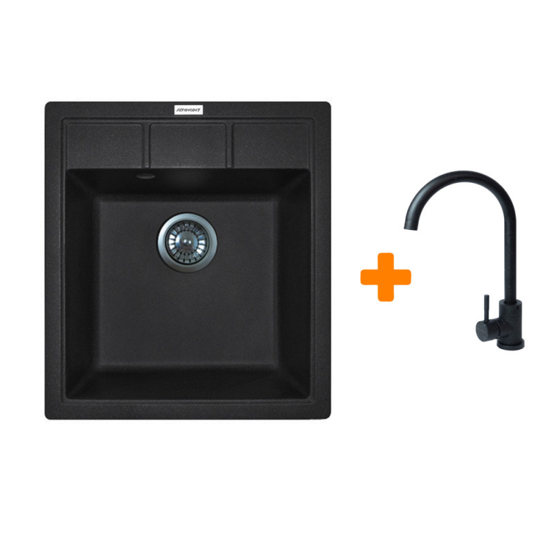 Adamant Набор кухонная Brick, искуственный камень, квадрат, без крыла, 460x515x200мм, чаша - 1, врезная, черный + смеситель (4824296209203)