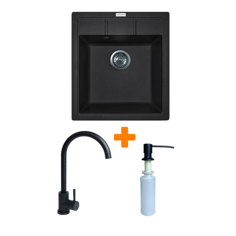 Adamant Набор кухонная Brick, искуственный камень, квадрат, без крыла, 460x515x200мм, чаша - 1, врезная, черный + смеситель и дозатор (4824296209703)