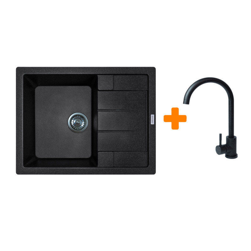 Adamant Набор кухонный Anila, искуственный камень, прямоуг., с крылом, 645х495х200мм, чаша - 1, врезная, черный + смеситель (182496910303)