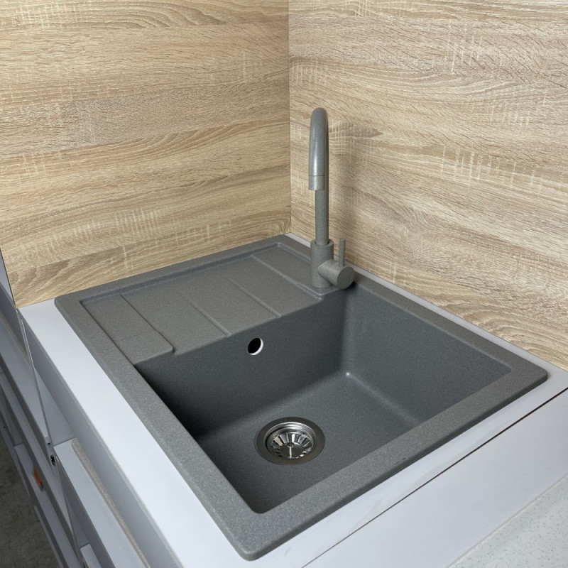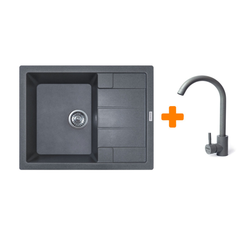 Adamant Набор кухонный Anila, искуственный камень, прямоуг., с крылом, 645х495х200мм, чаша - 1, врезная, серый + смеситель (182496910304)