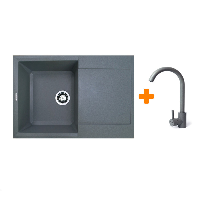 Adamant Набор кухонный Horizon, искуственный камень, прямоуг., с крылом, 780х495х230мм, чаша - 1, врезная, серый + смеситель (1824296911504)