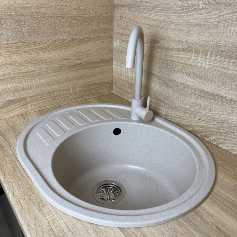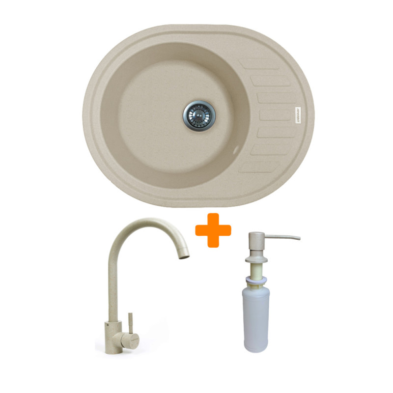 Adamant Набор кухонный Ovum, искуственный камень, овальная, с крылом, 615х495х200мм, чаша - 1, врезная, Avena + смеситель и дозатор (1824296900406)