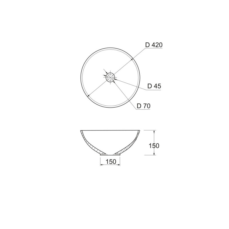 Раковина Adamant KREIS имеет круглую форму, изготовлена из искусственного камня с размерами 420 x 150 мм и белым цветом. Накладной тип установки без отверстия для смесителя и перелива позволяет монтаж сверху на столешницу. Материал создан по технологии Solid Surface, устойчив к воздействию и долговечен.