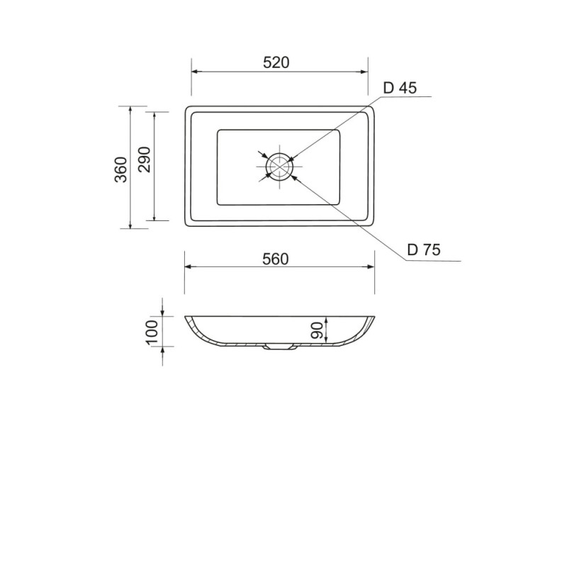 Раковина Adamant LOWER имеет прямоугольную форму, изготовлена из искусственного камня с размерами 560 x 360 x 100 мм и черно-белым цветом. Накладной тип установки с отверстием для смесителя и без отверстия для перелива позволяет монтаж сверху на столешницу. Материал создан по технологии Solid Surface, устойчив к воздействию и долговечен.
