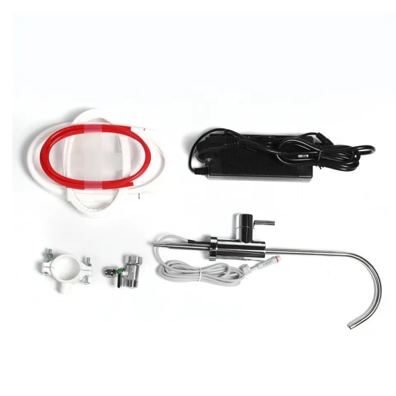 Комплектация:корпус фильтра, инструкция, комплект картриджів і мембрана, розумний кран для очищеної води, 3-ходовий з’єднувач, зливний патрубок, набір трубок, блок живлення