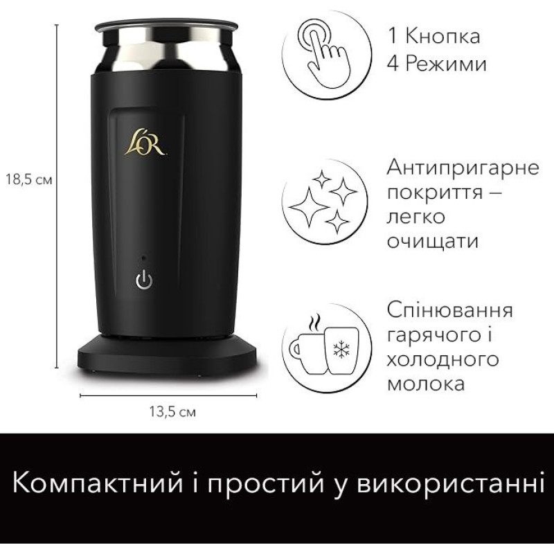Вспениватель молока L’OR — стационарный капучино-вспениватель для приготовления горячей и холодной молочной пены, а также для подогрева молока. Мощность 500 Вт обеспечивает стабильную работу. Вместимость составляет до 115 мл для вспенивания и до 250 мл в режиме подогрева. Антипригарное покрытие упрощает очистку после использования. Съемная крышка обеспечивает доступ к чаше и контроль процесса.