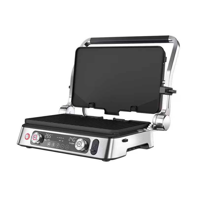 Регулируемый термостат, Антипригарное покрытие, Поддон для жира, Съемные пластины, Независимые зоны нагрева, Открытие на 180°, Рабочая поверхность - Плоская/Ребристая