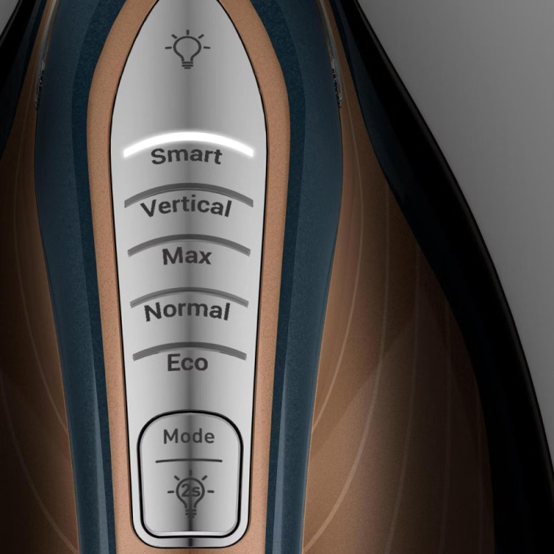 LED-подсветка, бесшумная технология, постоянное распределение пара на носике, по бокам и по центру, съемный резервуар для воды, отсек для хранения шнура – паровой шланг, 6 автоматичних налаштувань подачі пари та температури, час нагрівання 120 с