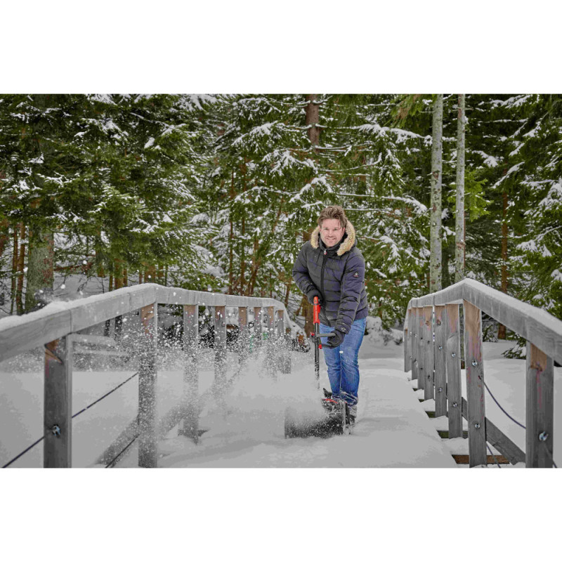 поворотний механізм викиду снігу з можливістю зміни напрямку, електронний контроль швидкості обертання, акумуляторний відсік із кришкою на магнітній фіксації для захисту від снігу та вологи, додаткова ручка для керування двома руками, вбудована ручка для транспортування, ергономічна основна рукоятка з м’яким покриттям, двоточковий запобіжний вимикач для запобігання випадковому запуску, можливість вертикального встановлення на поверхню для зберігання