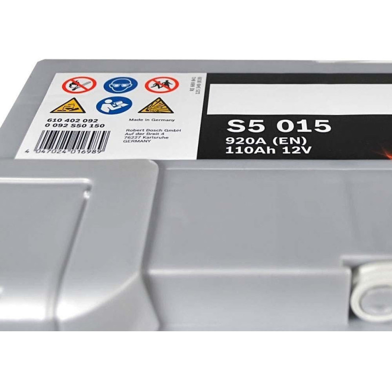 Аккумулятор Bosch S5 12 В 110 А·ч 920 А R+ (0 092 S50 150) предназначен для легковых автомобилей со стандартной электрической системой. Модель имеет полярность плюс справа и крепление B00 без дополнительной фиксации. Пусковой ток по EN составляет 920 А при емкости 110 А·ч. Габариты аккумулятора – 394 x 175 x 190 мм, вес с наполнением – 25,10 кг.