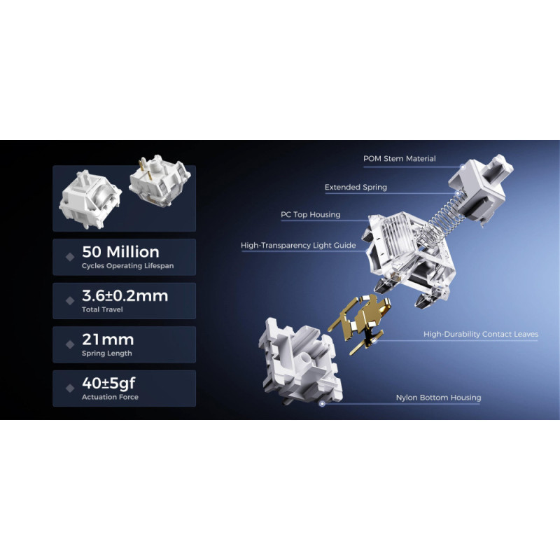 клавиатура, щетка для чистки, дополнительные переключатели, руководство пользователя, салфетка для чистки, 1 x Приемник Type-A 2.4GHz, 1 x съемник для колпачков клавиш и переключателей 2-в-1, 1 x кабель Type-A - Type-C