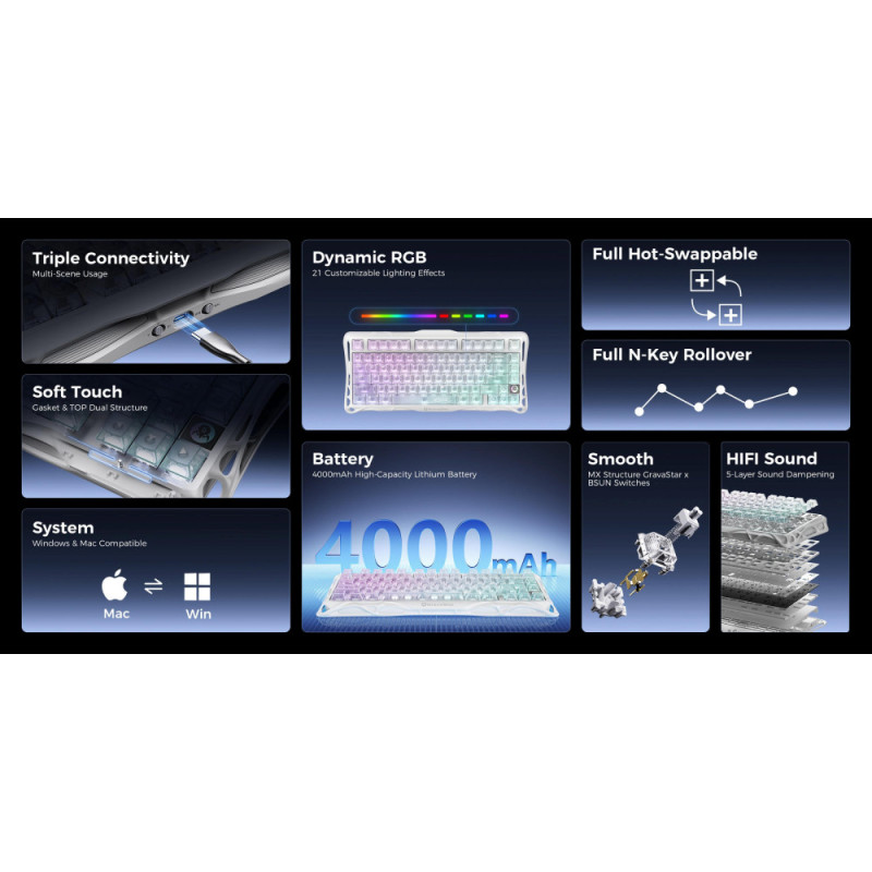 75% механическая клавиатура с линейными переключателями GravaStar x BSUN Grey, gasket mount и трирежимным подключением. Предлагает плавный ход, RGB-подсветку с 13 режимами через прозрачные кристальные колпачки и аккумулятор 4000 мАч. Подходит для гейминга и набора текста, где важны компактность, эстетика Crystal Aurora и качественный звук.