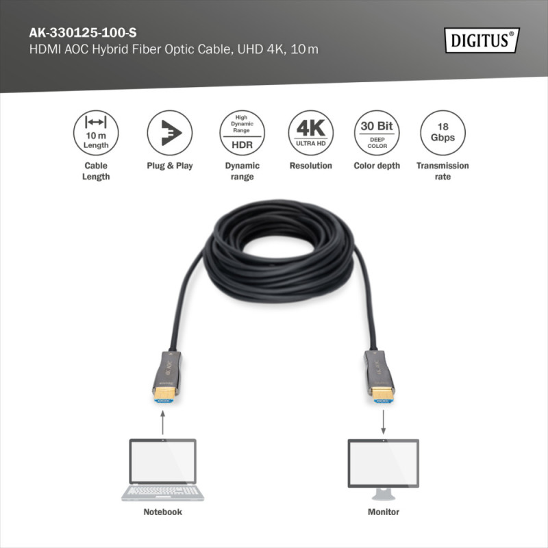 Digitus Кабель HDMI UHD 4K, AOC hybrid-fiber, type A M/M, 10м, черный (AK-330125-100-S)