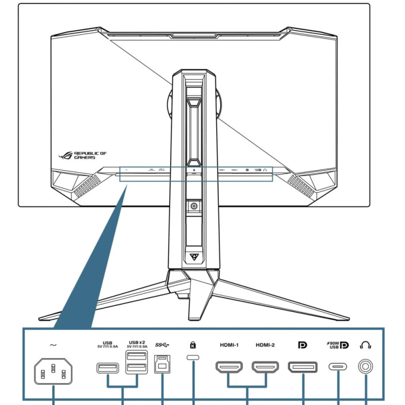 Earphone Jack, USB Hub : 3x USB 3.2 Gen 1 Type-A, HDMI (v2.1)x 2, USB-Cx 1 (DP Alt Mode), DisplayPort 2.1x 1, USB-C Power Delivery : 90 Вт