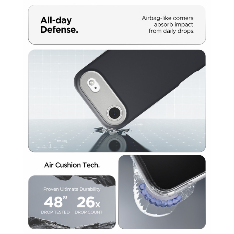 Spigen Nano Pop MagFit Black Sesame для iPhone 17 Air — стильный двухцветный чехол с мягкой силиконовой текстурой, MagSafe-совместимостью и защитой от падений с технологией Air Cushion. Выполнен из качественных материалов PC + TPU.