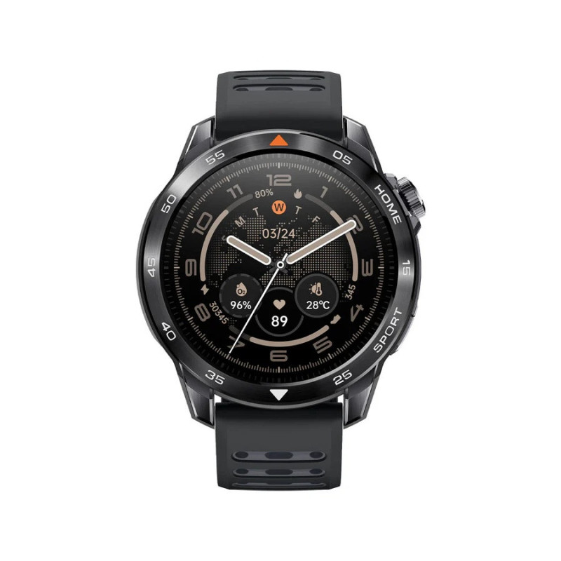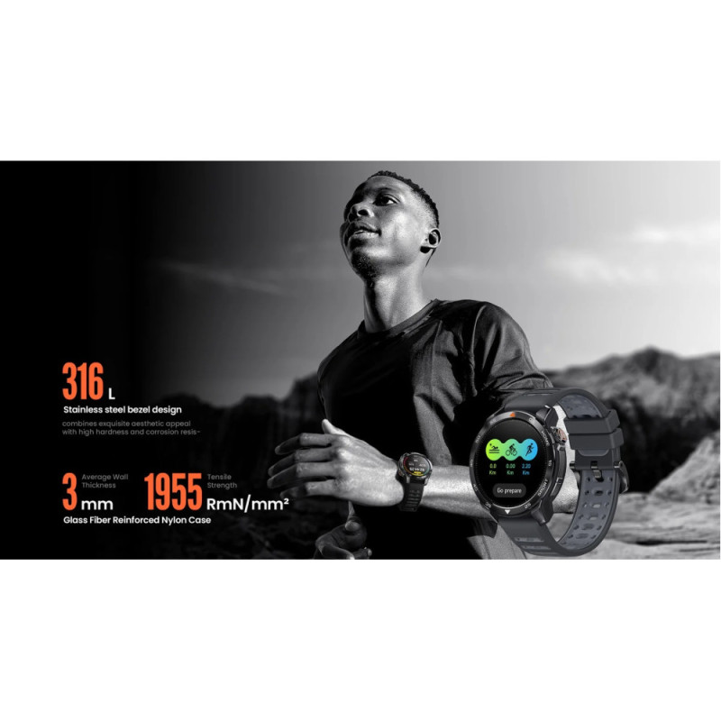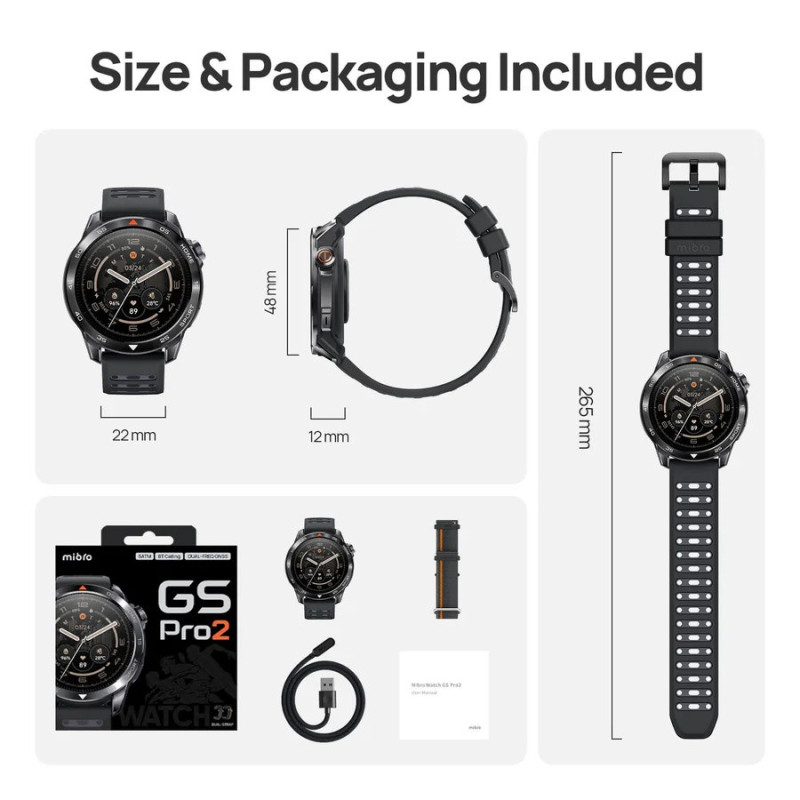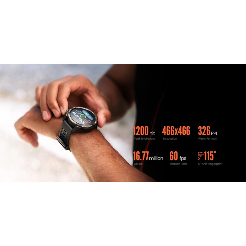 Смарт-часы Mibro GS Pro 2 в темно-сером цвете оснащены AMOLED-дисплеем 1.43 дюйма с разрешением 466x466 пикселей и яркостью до 1200 нит для четкого изображения в любых условиях. Корпус сочетает нержавеющую сталь 316L с армированным полимером, обеспечивая защиту 5 ATM и вес около 61.6 г с силиконовым ремешком. Двухчастотный GNSS, более 150 спортивных режимов с триатлоном и мониторинг здоровья делают устройство подходящим для длительных активностей и навигации.