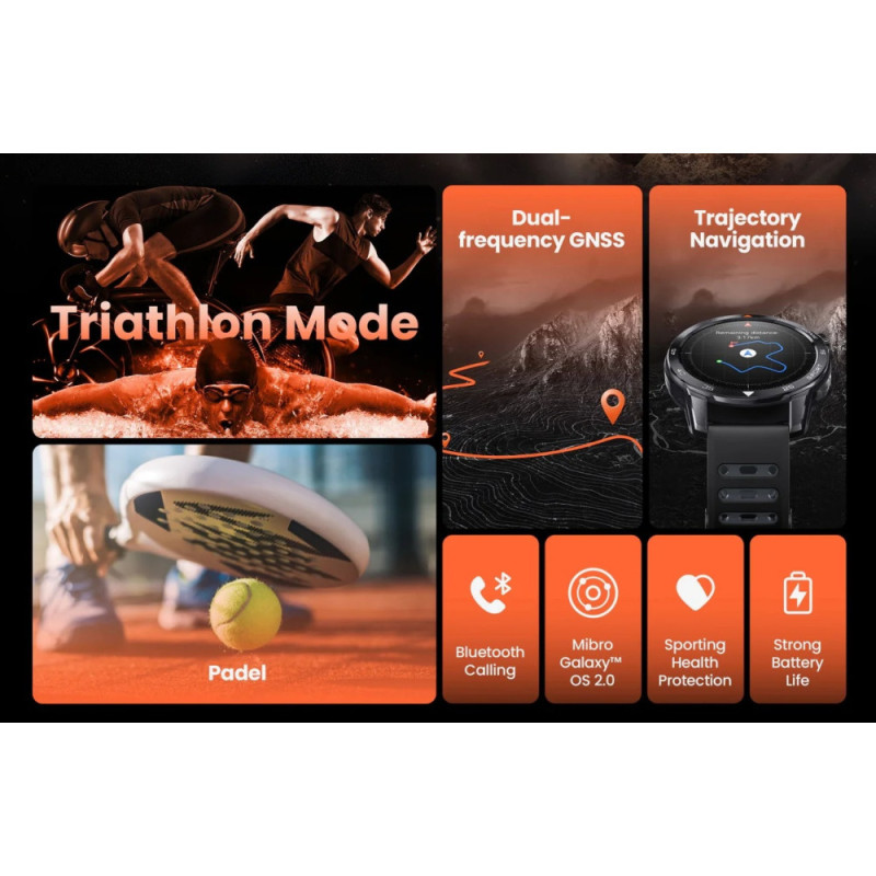 150+ спортивних режимів, бігові метрики та тренувальний аналіз, аналіз тренувального навантаження, маршрути та навігація, режим триатлону (автоперемикання плавання/велосипед/біг)
