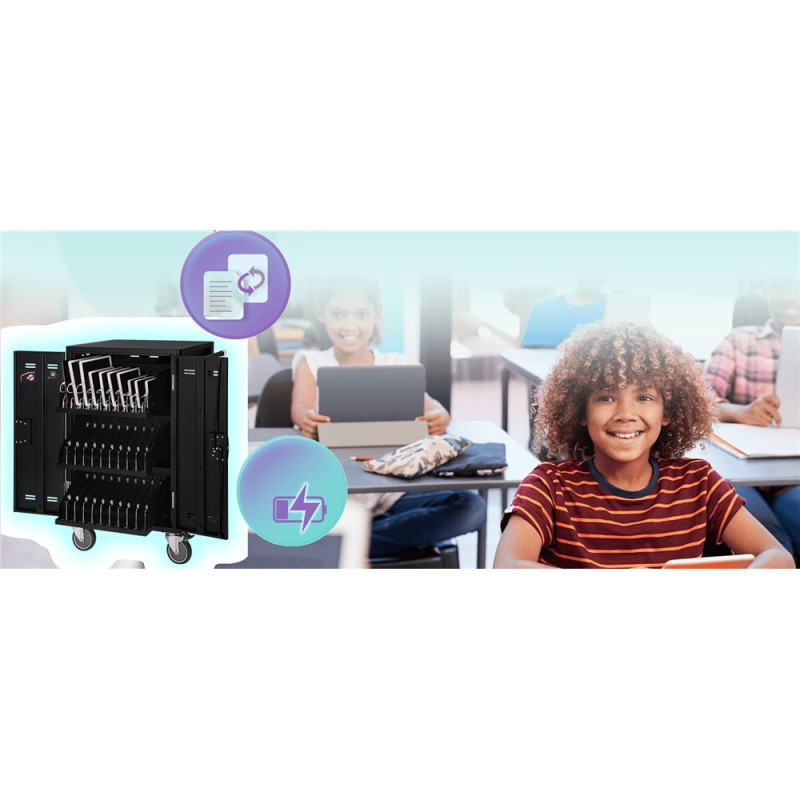 AVer C30U+ – компактная зарядная тележка для одновременной зарядки и синхронизации до 30 устройств через USB Type-C. Подходит для учебных классов с ограниченным пространством. Выдвижные полки обеспечивают удобный доступ к планшетам, а система охлаждения поддерживает стабильную работу. Светодиодные индикаторы упрощают контроль процессов зарядки и синхронизации. Конструкция с колесами позволяет легко перемещать тележку между аудиториями.