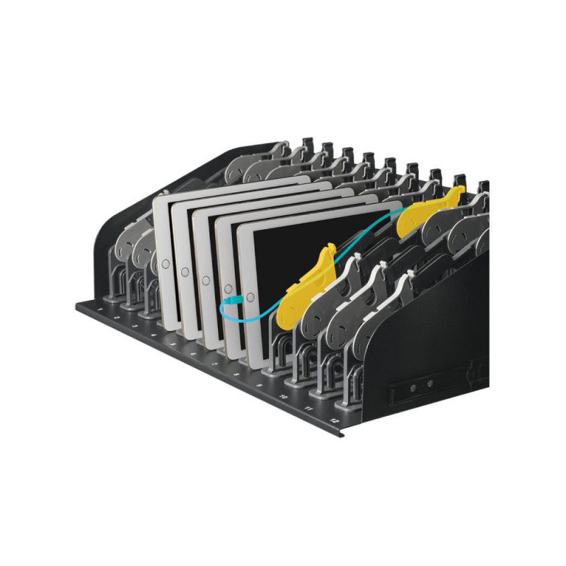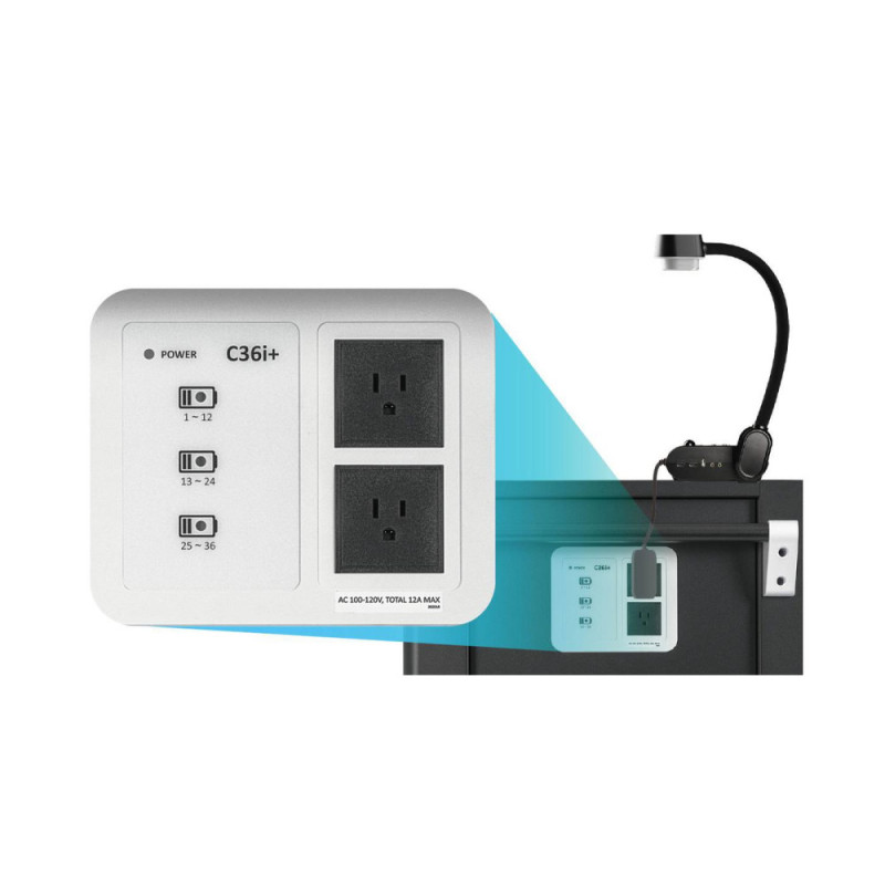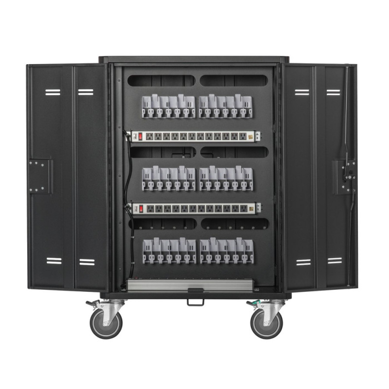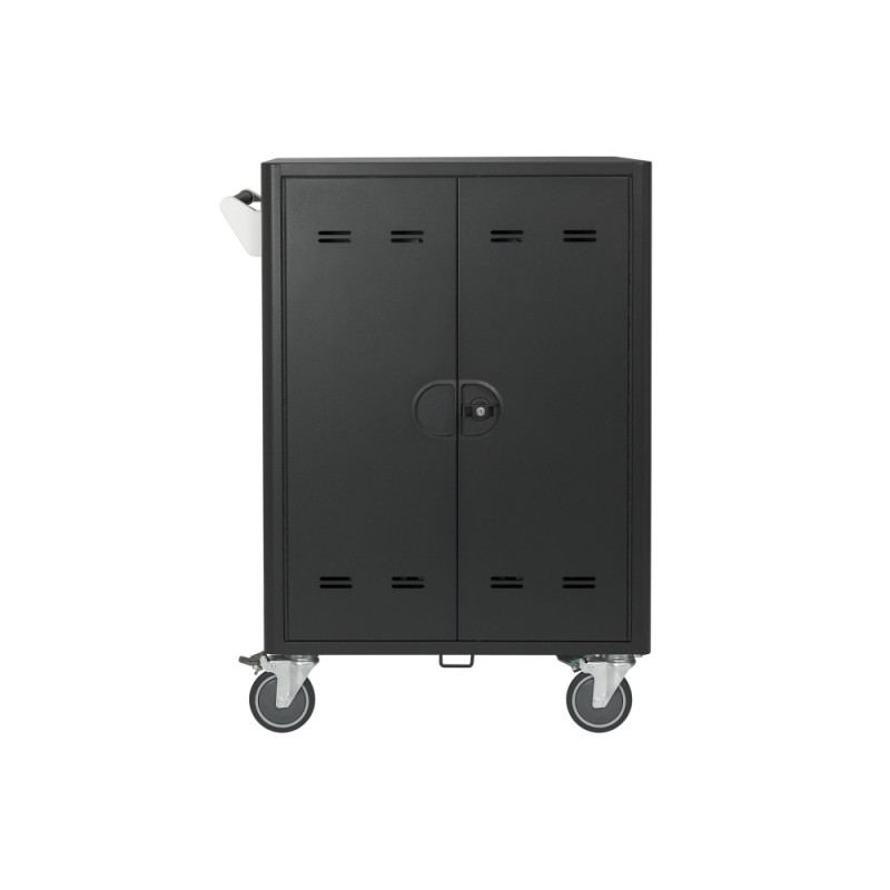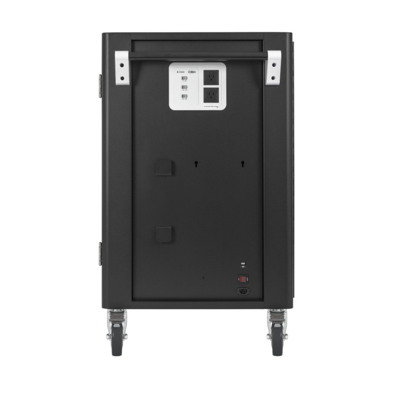 Особенности:индикатор питания, регульований дільник з фіксатором кабелю, висувні полиці, світлодіоди стану зарядки (x3 зони), до 36 пристроїв, тип заряджання: Змінний струм/Інтелектуальна, 5-дюймові коліщатка - 4 шт., гак безпеки, 2 зовнішні розетки живлення