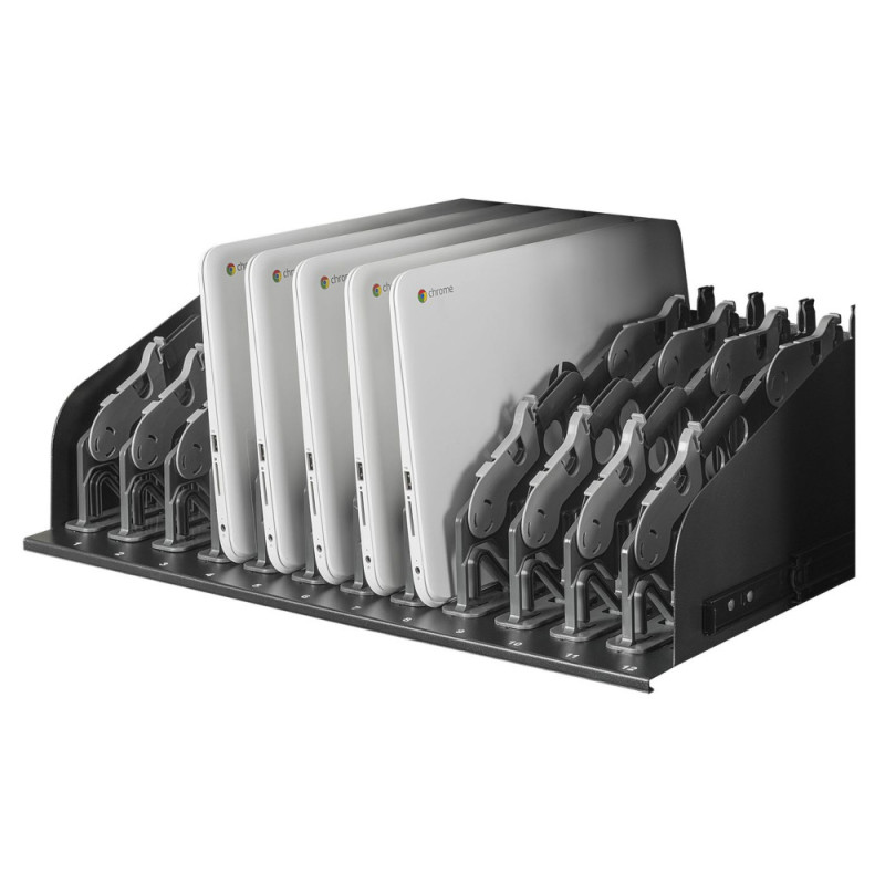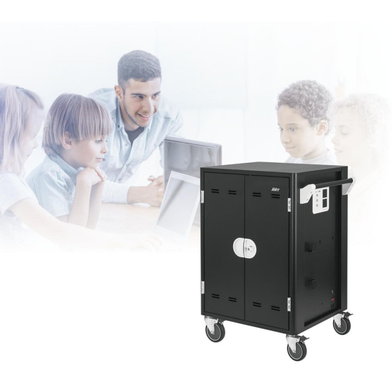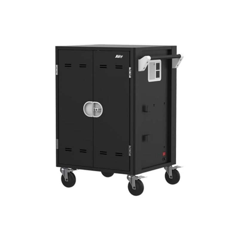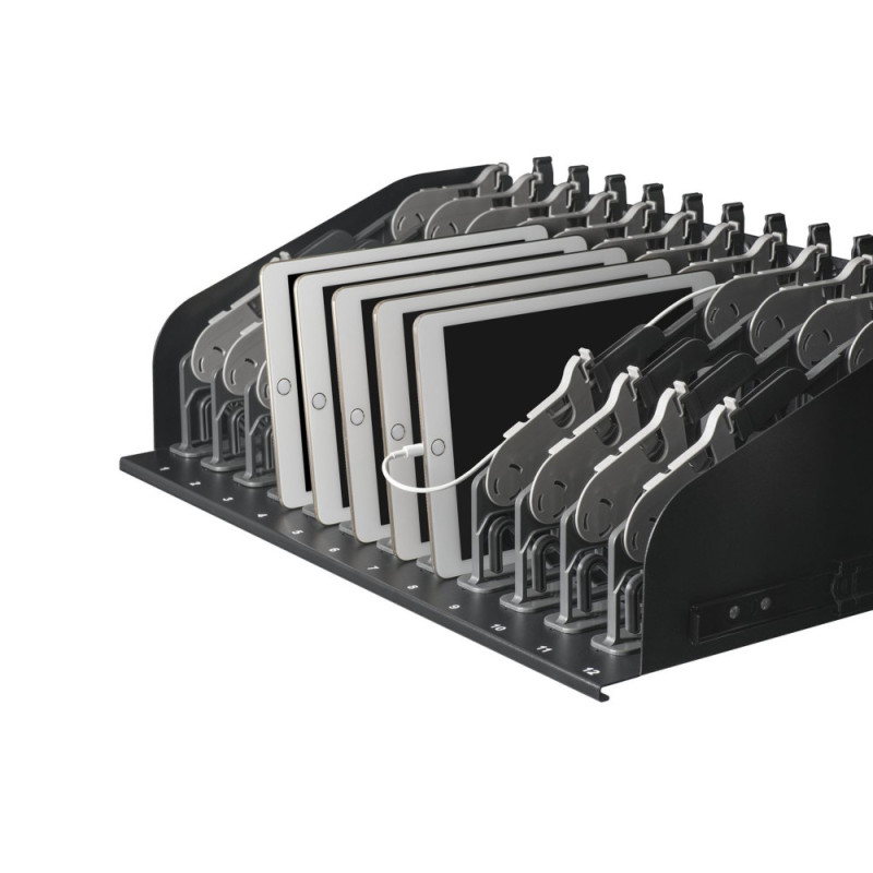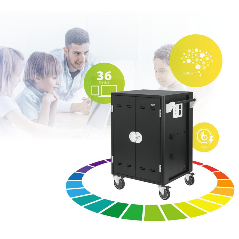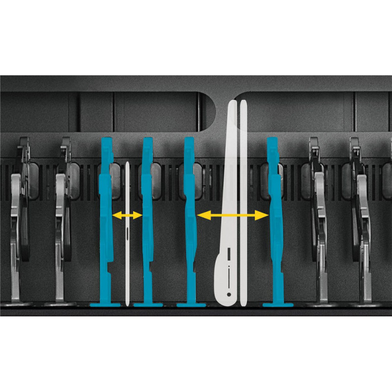 Особенности:индикатор питания, регульований дільник з фіксатором кабелю, висувні полиці, світлодіоди стану зарядки (x3 зони), до 36 пристроїв, тип заряджання: Змінний струм/Інтелектуальна, 5-дюймові коліщатка - 4 шт., гак безпеки, 2 зовнішні розетки живлення