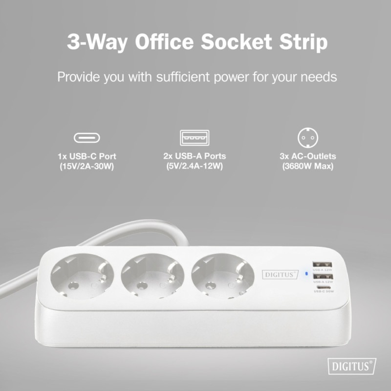 Digitus Блок розеток DIGITUS Office, 3xSchuko, 2xUSB-A, 1xUSB-C, 16A, 1.5м, вилка Schuko, білий (DA-70626)