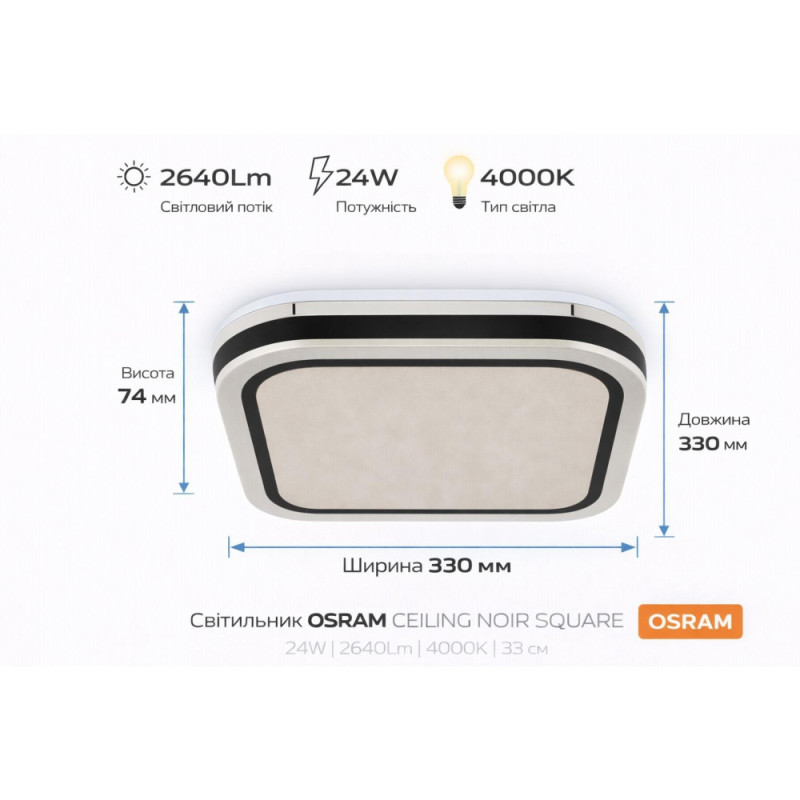 Накладной светильник OSRAM CEILING NOIR Square 330 мм имеет квадратную форму размером 33×33 см. Мощность составляет 24 Вт, цвет свечения — нейтральный 4000 K. Световой поток достигает 2640 лм при угле рассеивания 120°. Основание выполнено из металла белого цвета, а плафон — из чёрного полимера. Высота изделия 74 мм, вес 0,63 кг, срок службы 30 000 часов.