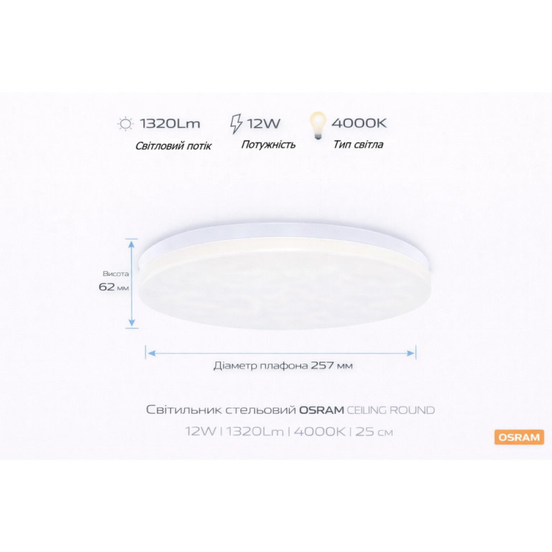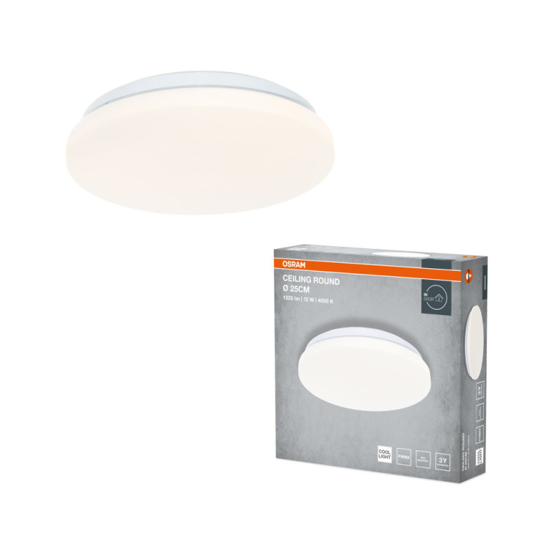 Потолочный светильник OSRAM CEILING ROUND — накладной светильник для общего освещения небольших помещений. Встроенный светодиодный модуль создает равномерный свет нейтрального оттенка с температурой 4000 К. Световой поток 1320 лм обеспечивает базовый уровень освещения для повседневных задач. Угол рассеивания 120° обеспечивает равномерное освещение пространства без резких переходов света и тени.
