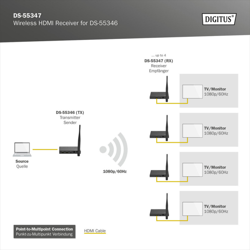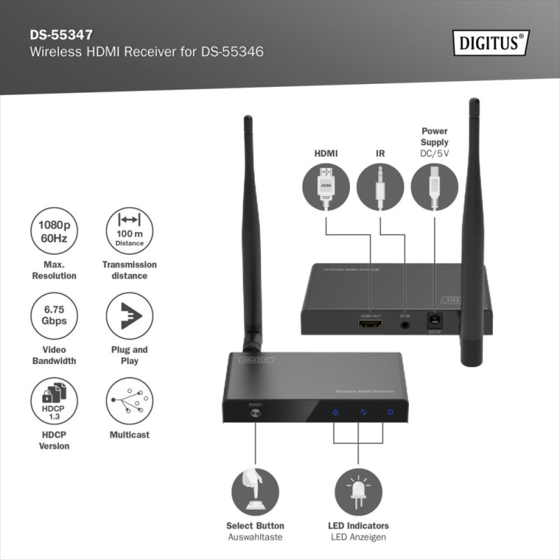 Digitus Беспроводной приемник HDMI для DS-55346, Full HD, 100м (DS-55347)