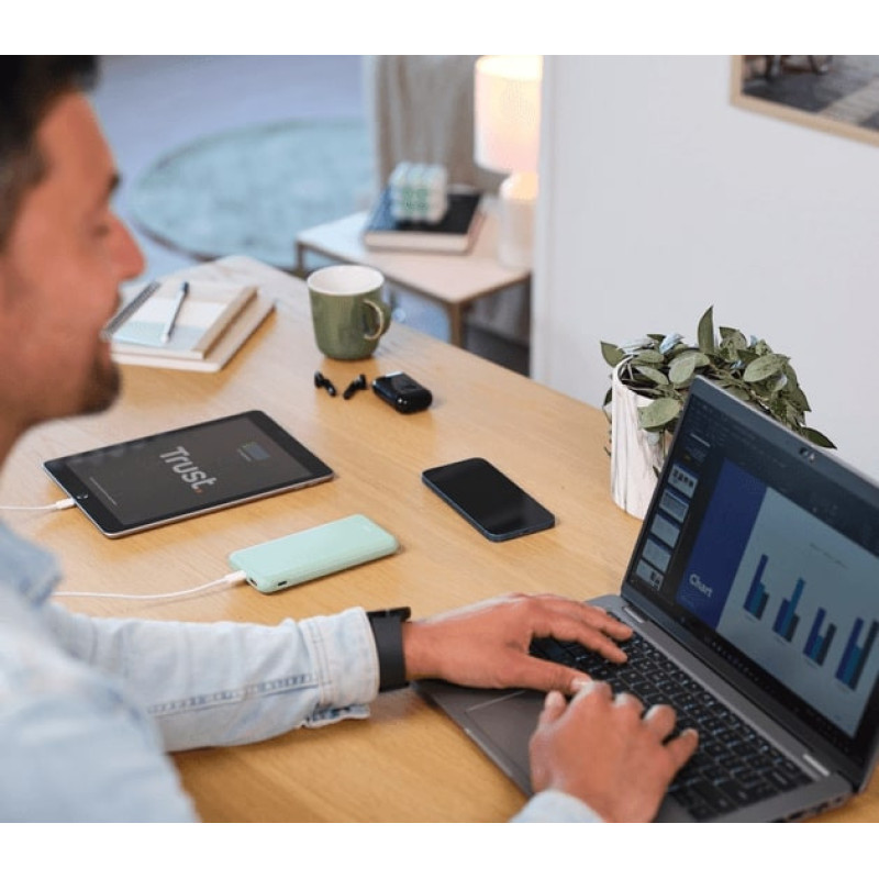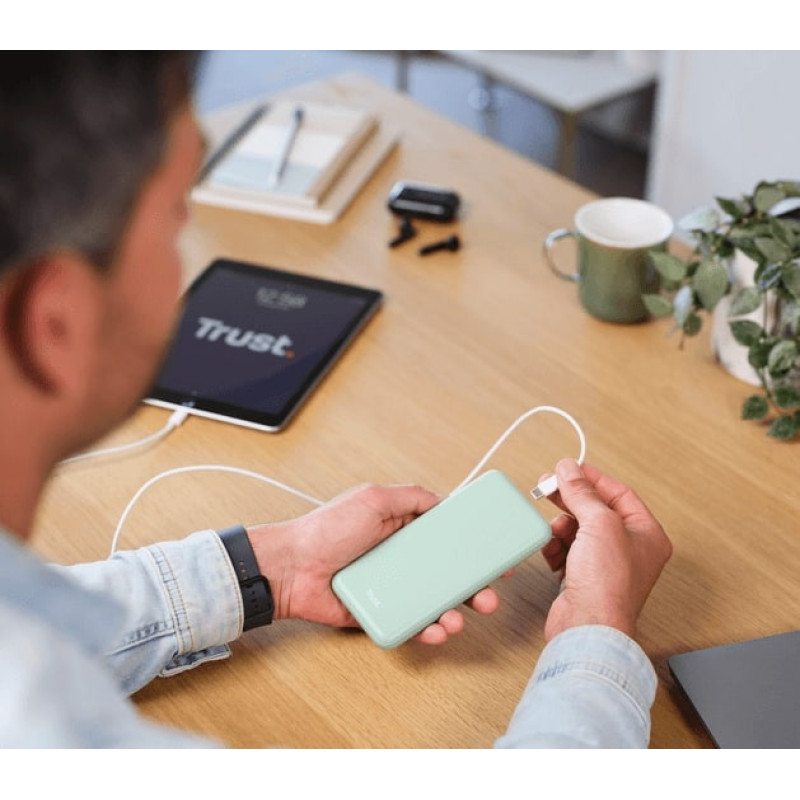 Power Bank Trust Redoh (25033_TRUST) — портативний акумулятор на 10000 мА·год (37 Вт·год) з трьома портами (1x USB-A, 2x USB-C), підтримкою швидкої зарядки 18 Вт (QC 3.0, PD 2.0). Виготовлений із 50% переробленого пластику (ABS/PC), вага 231 г, розміри 69x144x16 мм. LED-індикатори рівня заряду, захист від перезаряду. Зарядний кабель USB-A до USB-C у комплекті, сумісний зі смартфонами та планшетами. Зелений колір.