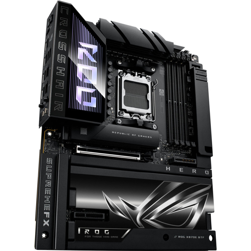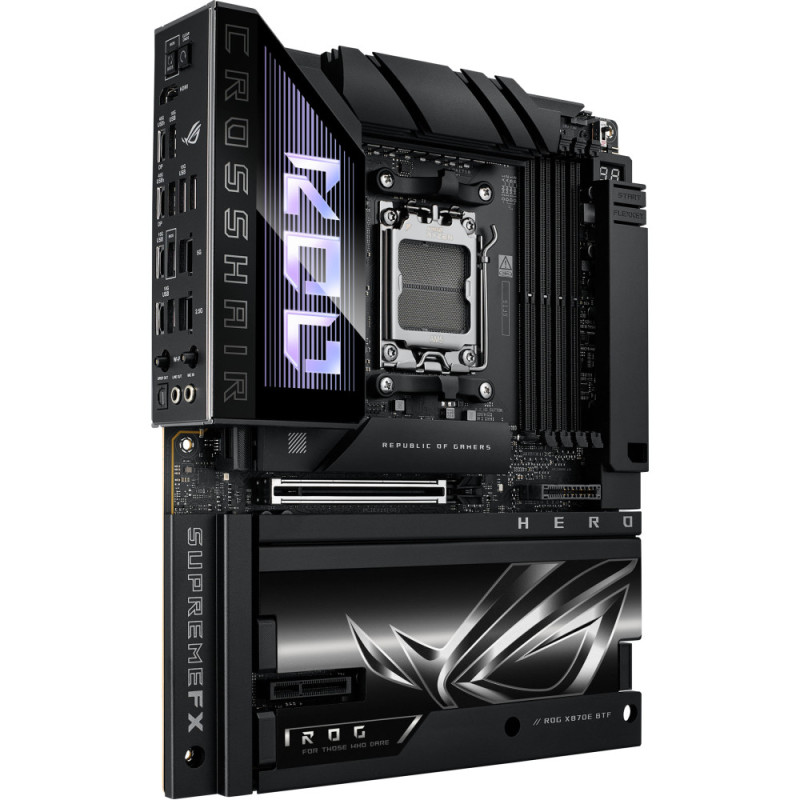 ASUS ROG Crosshair X870E Hero BTF — флагманська материнська плата з інноваційною системою прихованого підключення рознімів для створення акуратного вигляду збірки. Оснащена чипсетом AMD X870E, підтримує процесори Ryzen 9000, 8000 та 7000, пам’ять DDR5 до 256 ГБ і PCIe 5.0. Потужна система живлення, Wi-Fi 7, дві мережеві карти 5 Гбіт + 2.5 Гбіт і технології AI Overclocking та AI Cooling II забезпечують виняткову продуктивність і тишу під час роботи.