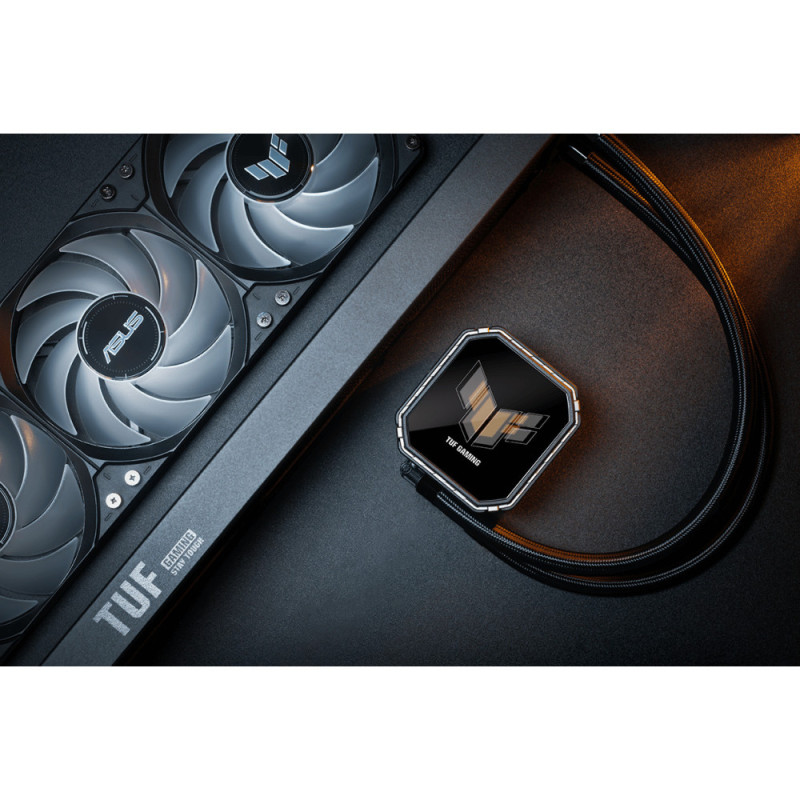 ASUS TUF Gaming LC III 360 ARGB LCD — рідинна система охолодження процесора з 360-мм радіатором і трьома 120-мм ARGB-вентиляторами для ефективного тепловідведення. Оснащена 2,8″ IPS-дисплеєм, який відображає дані моніторингу в реальному часі або користувацький контент (зображення, GIF, MP4). Помпа з оптимізованою конструкцією та попередньо нанесеною термопастою забезпечує стабільну роботу під високими навантаженнями. Посилені шланги з нейлоновим обплетенням підвищують довговічність, а сумісність із Intel LGA 1851/1700/1200 і AMD AM5/AM4 робить систему універсальною. Підтримує синхронізацію підсвічування через Aura Sync.