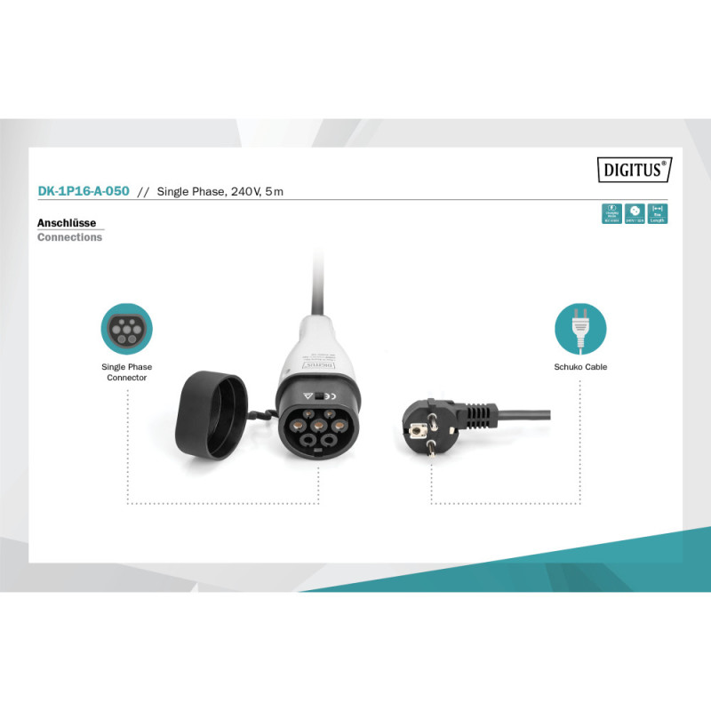 Digitus Кабель зарядний EV Single Phase, 230V, 8-16А, 5 m, Schuko to Type 2, з блоком керування та індикуації заряду (DK-1P16-A-050)